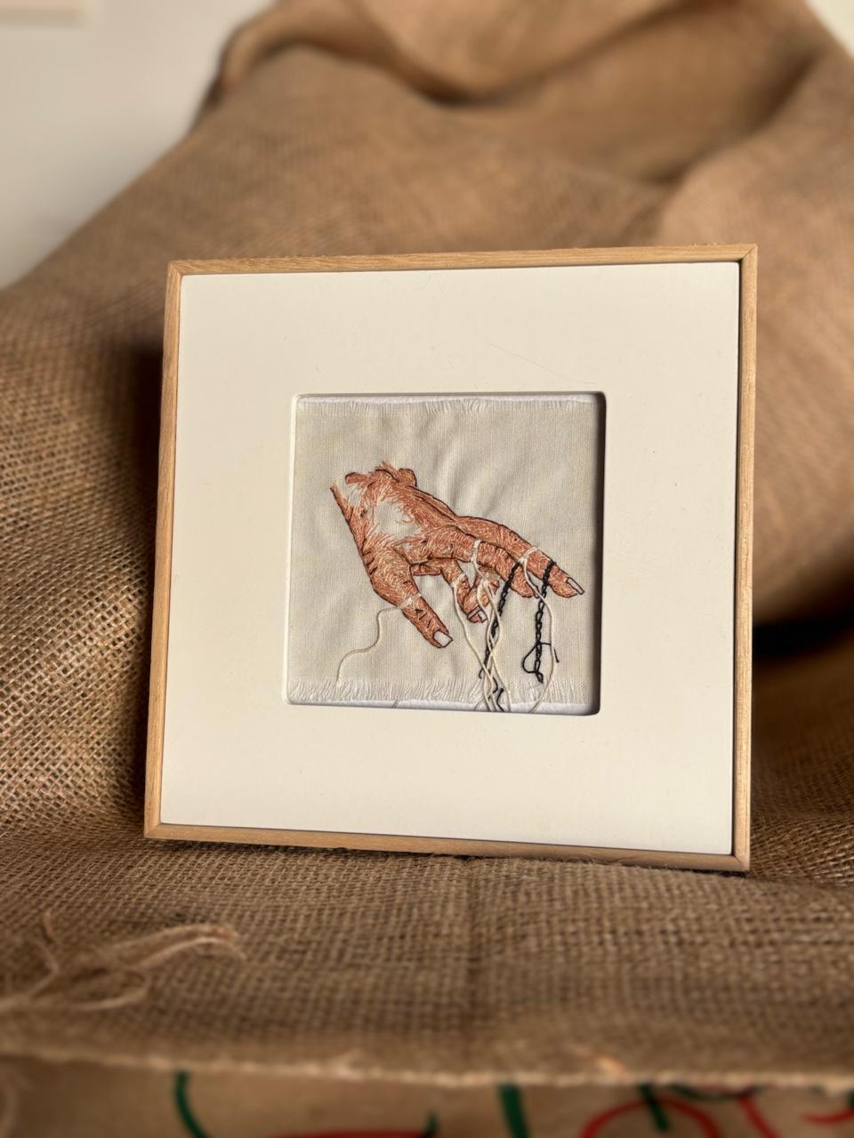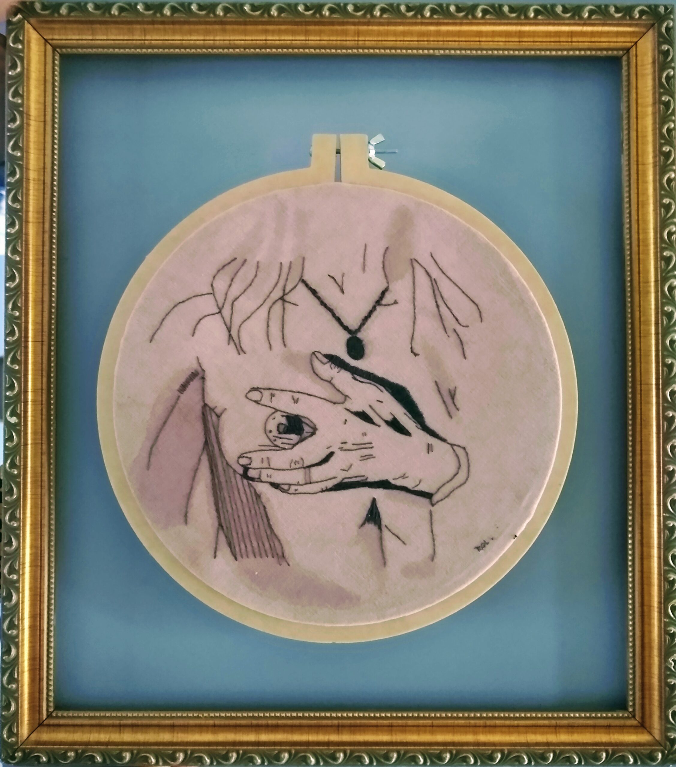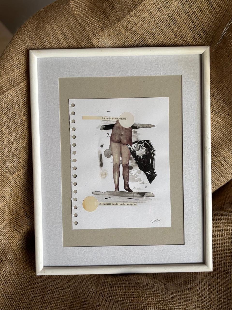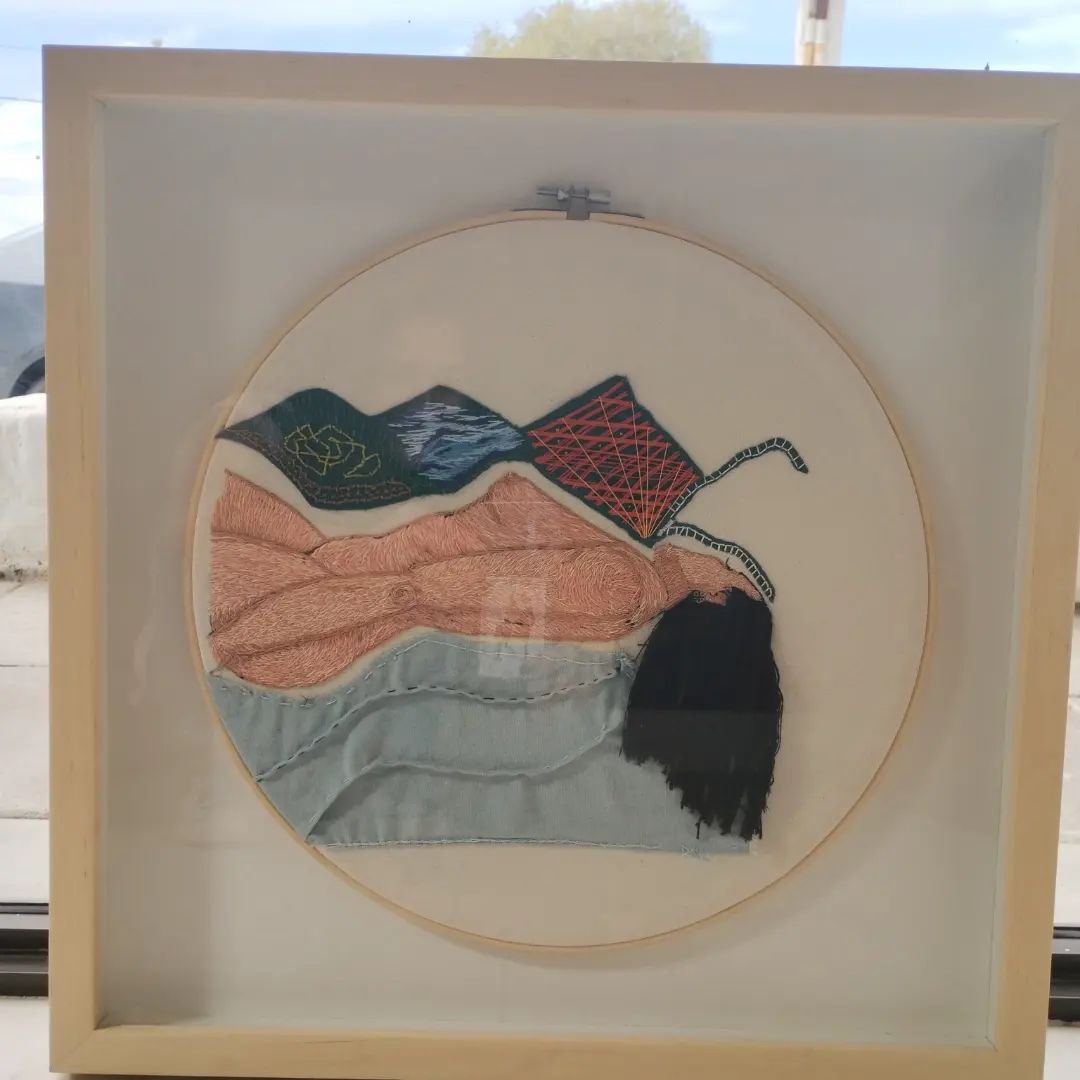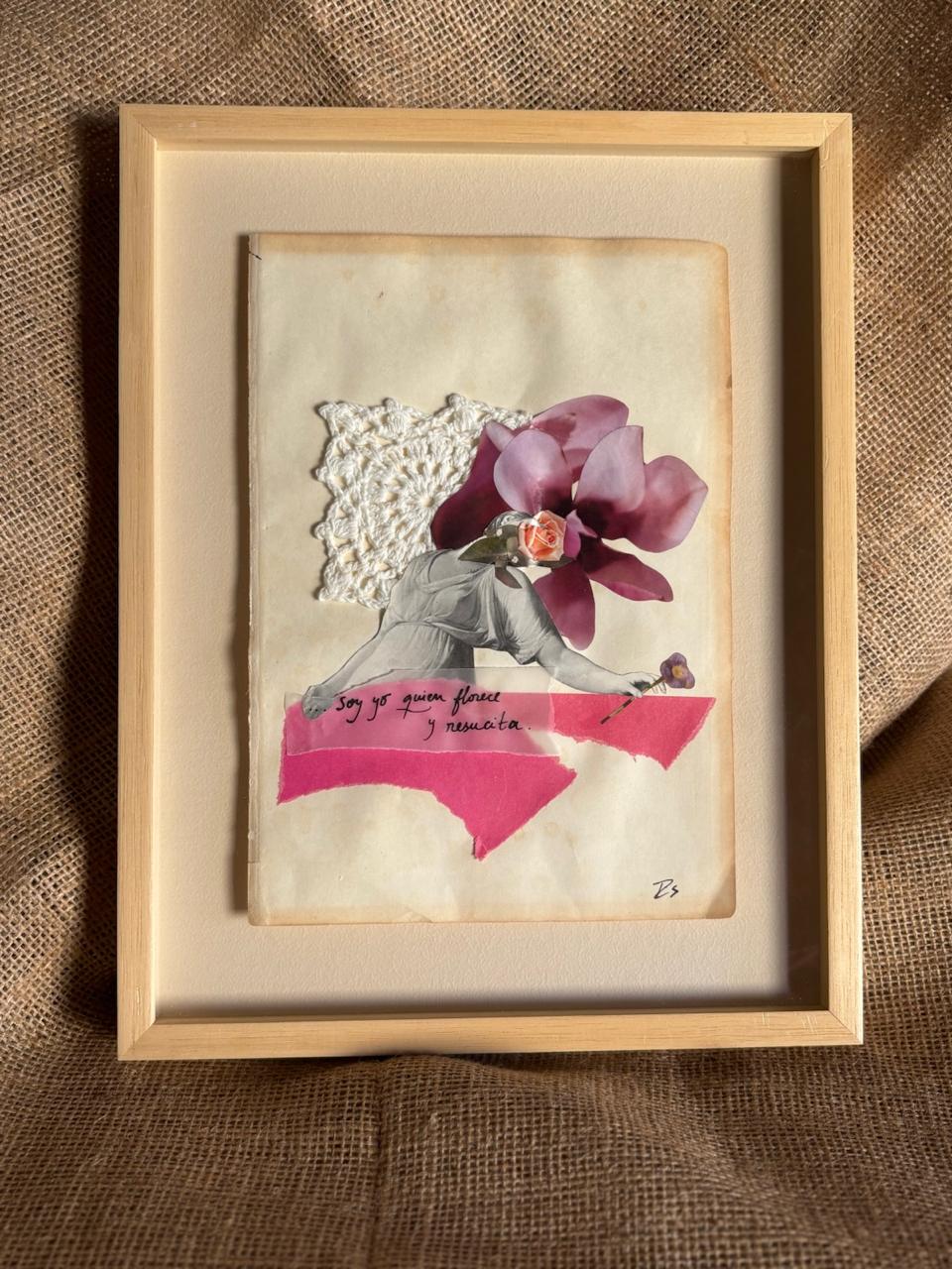 AmuletoBordado manual y serigrafía propia. 11cm.JulioBordado manual en tela antigua. Inspirado en Julio Cortázar. 16cm.BichaBordado de relieve en bastidor original. Lienzo antiguo. 11cmEntramadaBordado manual con apliques de tul. 13cmFondoBordado con tanza recuperada de la costa. En tela intervenida con tinte natural. 11cmAlma MaterBordado manual. Lienzo teñido con malbec. Bastidor en el que fue realizado. 38cm x 38cmManoCrearBordado manual enmarcado. Bastidor original de confección con aguja utilizada. 18,50cm x 18,50cmInternaBordado manual (revés). 26,5cm x 24cmInternoBordado manual (revés). 29cm x 25cmLa ComuniónBordado en tela con hilos de seda antiguos (pelo) y apliques de telas antiguas. 45cm x 45cm DescalzaÓleo sobre cartón 63cm x 51cmEl SaltoÓleo sobre tela inspirado en Baryshnikov 34cm x 28,5cm El nacimiento de las olasAcuarela intervenida con carbonilla, y bordado en papel. 27,5cm x 26cmIntroIlustración original intervenida. Enmarcada en vidrio. 31cm x 25cmRitualFotografía intervenidaLo que eraFotografía intervenidaCeibo FloreceCollage inspirado en poema con aplique de tejido vintage. 32cm x 25cmGon-KImpulsoCollage analógico. 27,5cm x 22,5cm Re-Misión TransgeneracionalMacramé tejido con apliques de alambre. 78cm x 98cm
