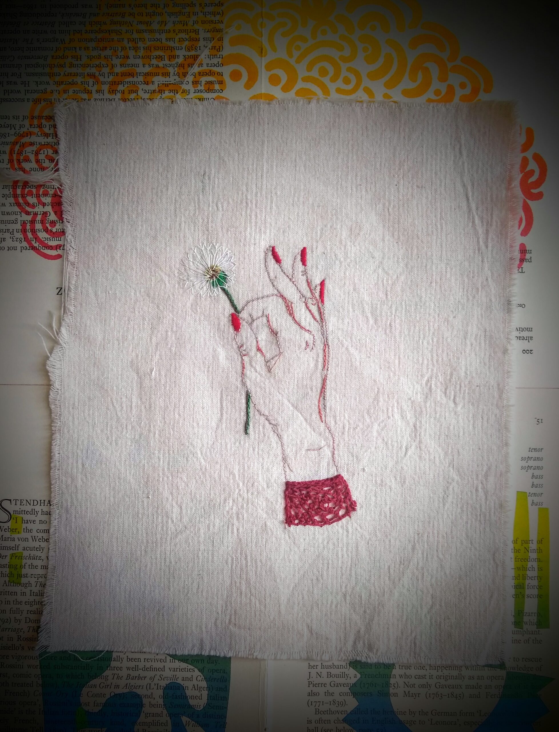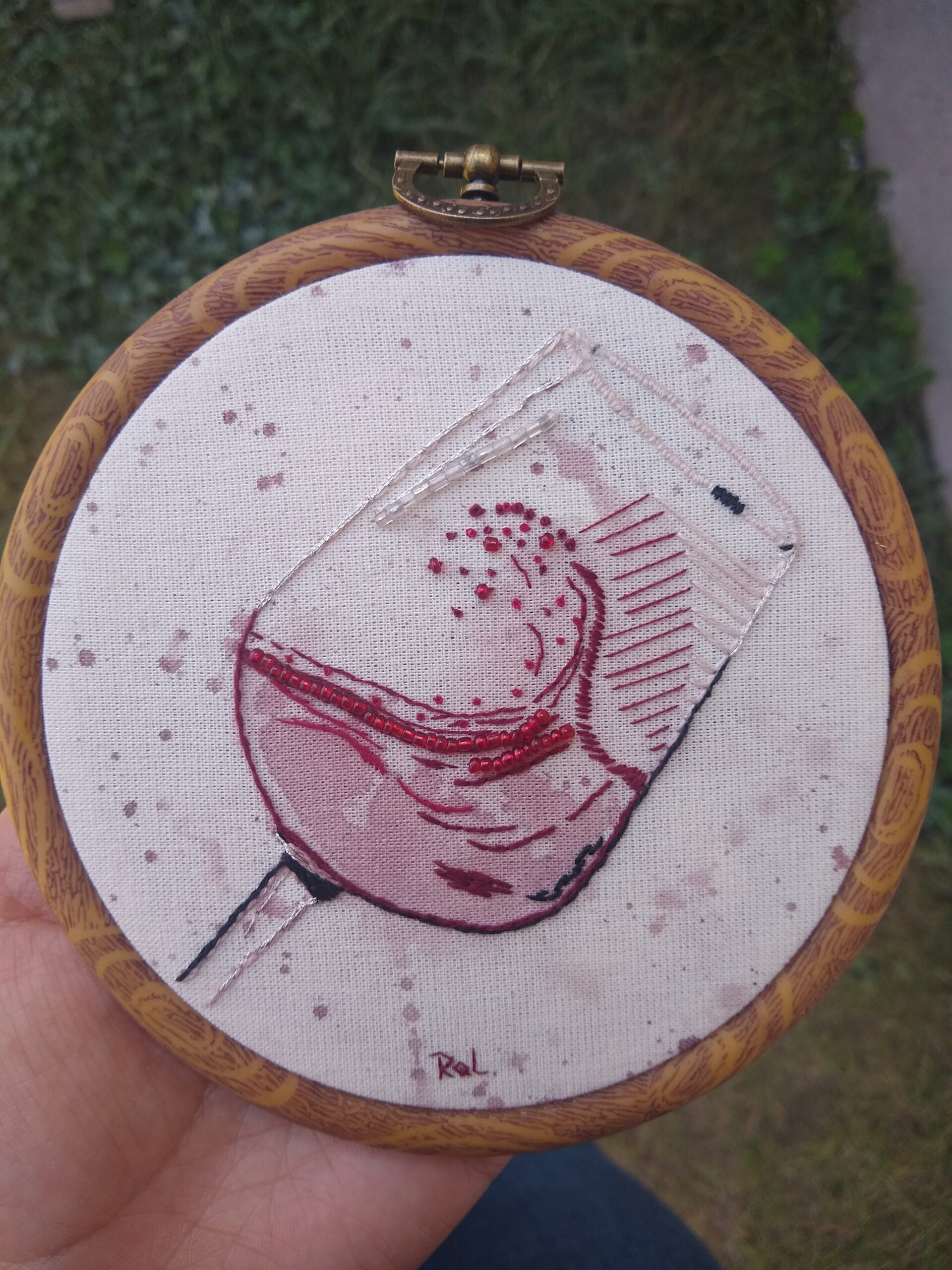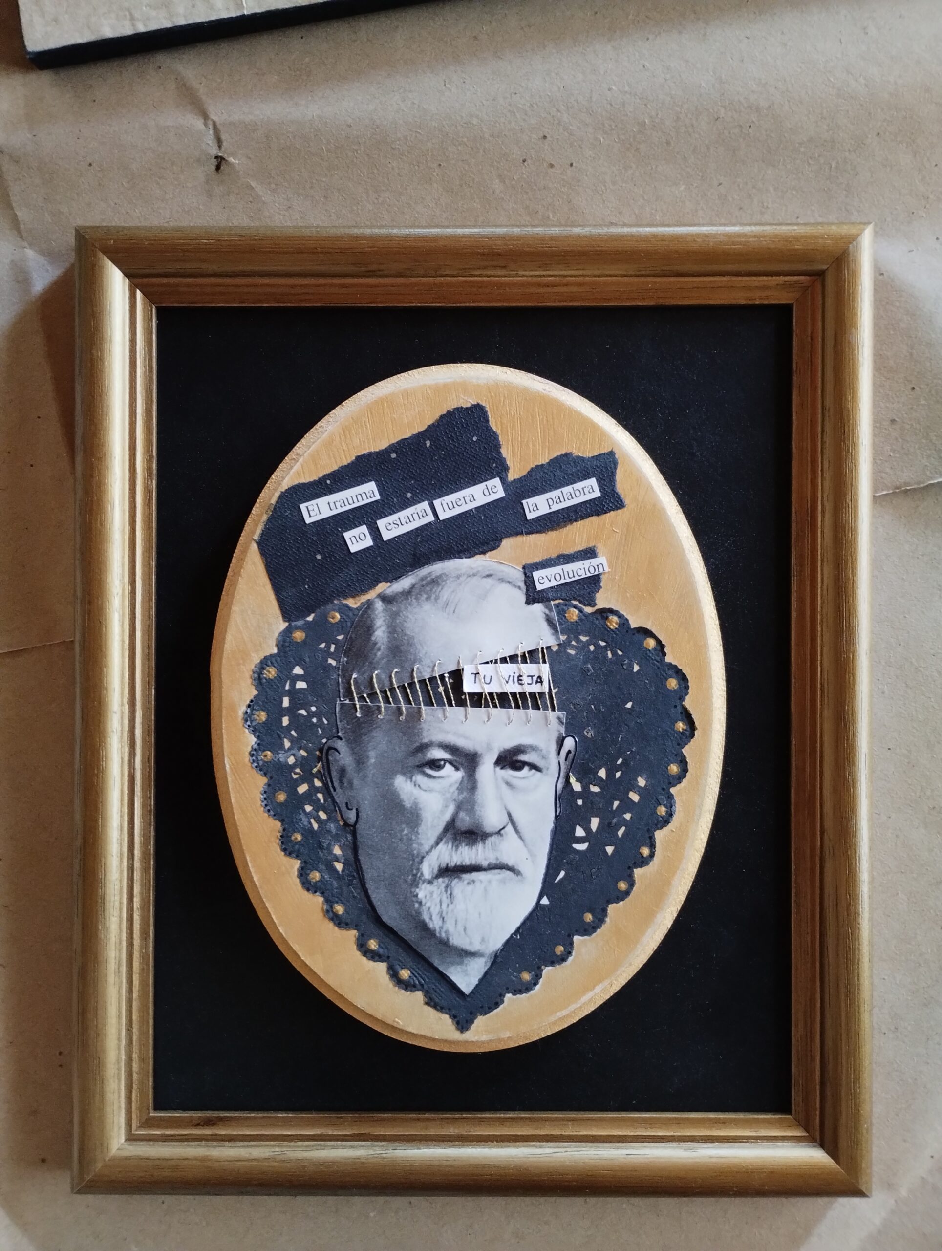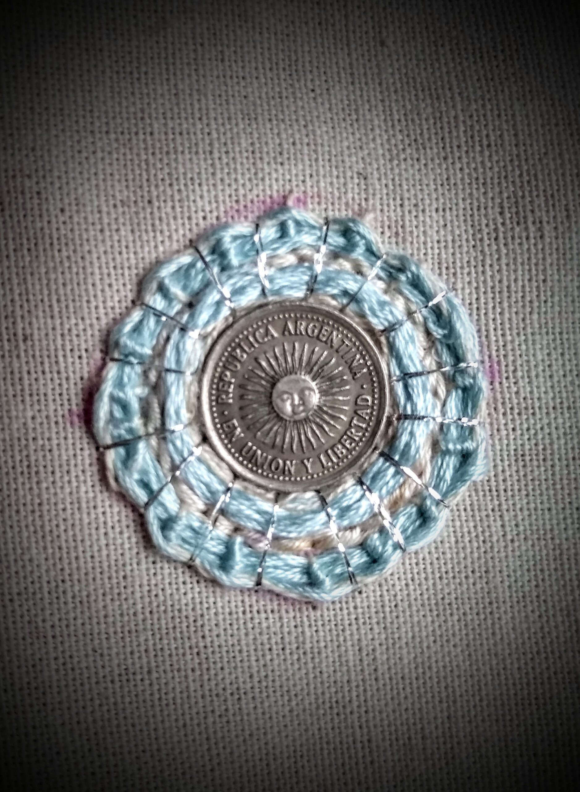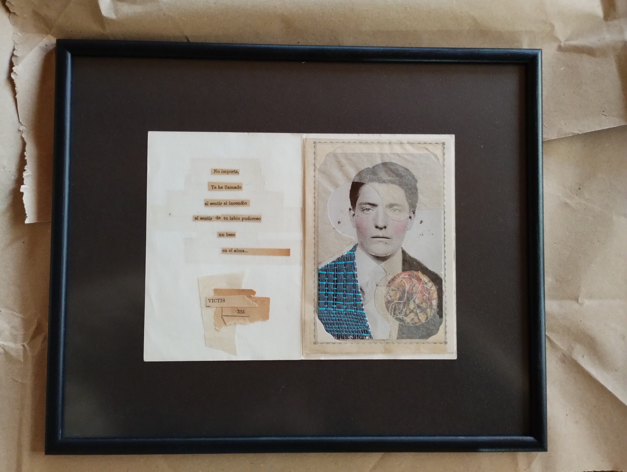 AmuletoBordado manual y serigrafía propia. 11cm.JulioBordado manual en tela antigua. Inspirado en Julio Cortázar. 16cm.BichaBordado de relieve en bastidor original. Lienzo antiguo. 11cmEntramadaBordado manual con apliques de tul. 13cmFondoBordado con tanza recuperada de la costa. En tela intervenida con tinte natural. 11cmAlma MaterBordado manual. Lienzo teñido con malbec. Bastidor en el que fue realizado. 38cm x 38cmManoCrearBordado manual enmarcado. Bastidor original de confección con aguja utilizada. 18,50cm x 18,50cmInternaBordado manual (revés). 26,5cm x 24cmInternoBordado manual (revés). 29cm x 25cmLa ComuniónBordado en tela con hilos de seda antiguos (pelo) y apliques de telas antiguas. 45cm x 45cm DescalzaÓleo sobre cartón 63cm x 51cmEl SaltoÓleo sobre tela inspirado en Baryshnikov 34cm x 28,5cm El nacimiento de las olasAcuarela intervenida con carbonilla, y bordado en papel. 27,5cm x 26cmIntroIlustración original intervenida. Enmarcada en vidrio. 31cm x 25cmRitualFotografía intervenidaLo que eraFotografía intervenidaCeibo FloreceCollage inspirado en poema con aplique de tejido vintage. 32cm x 25cmGon-KImpulsoCollage analógico. 27,5cm x 22,5cm Re-Misión TransgeneracionalMacramé tejido con apliques de alambre. 78cm x 98cm