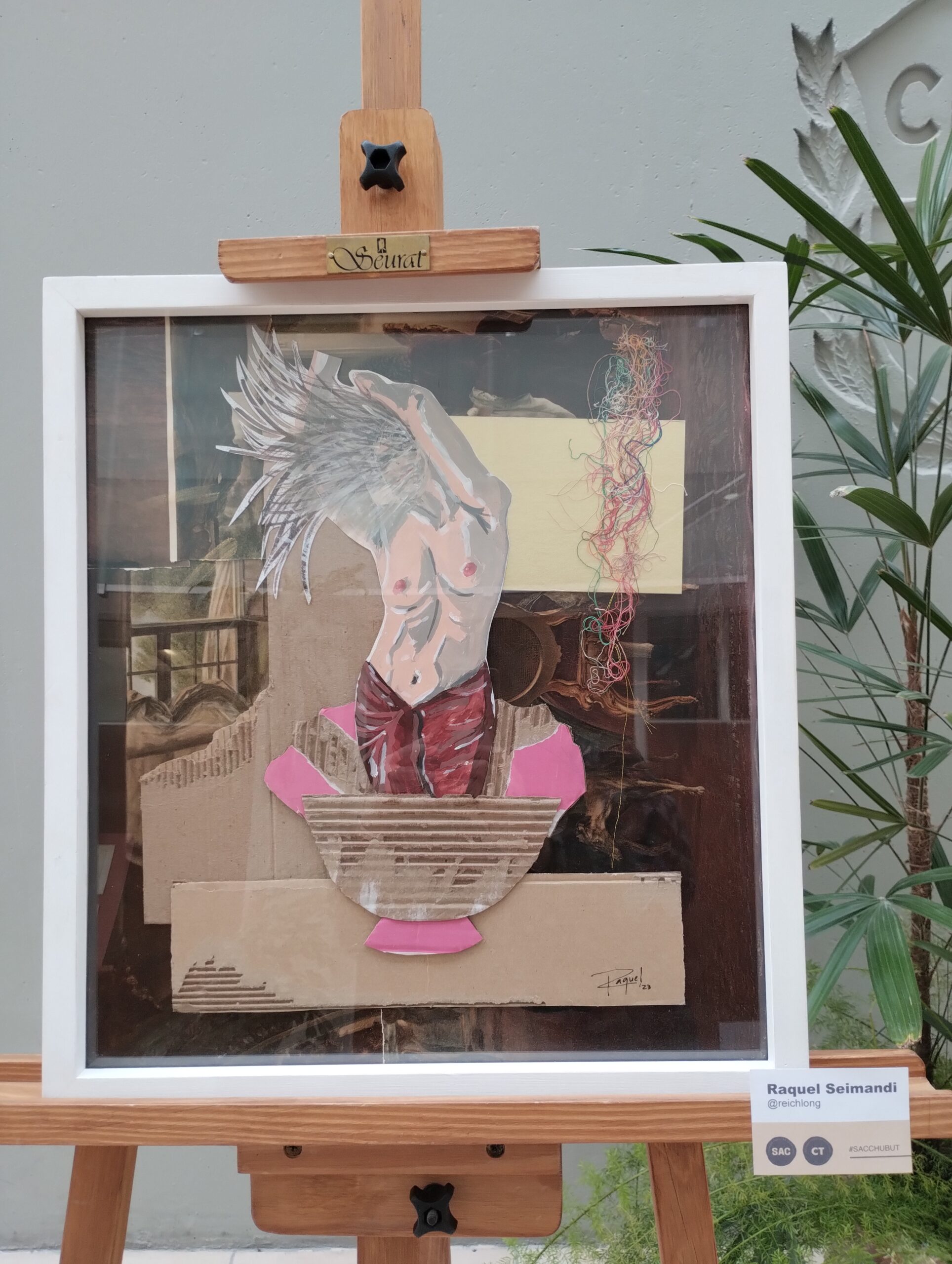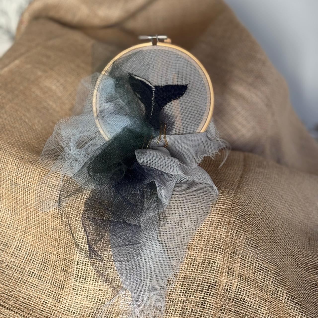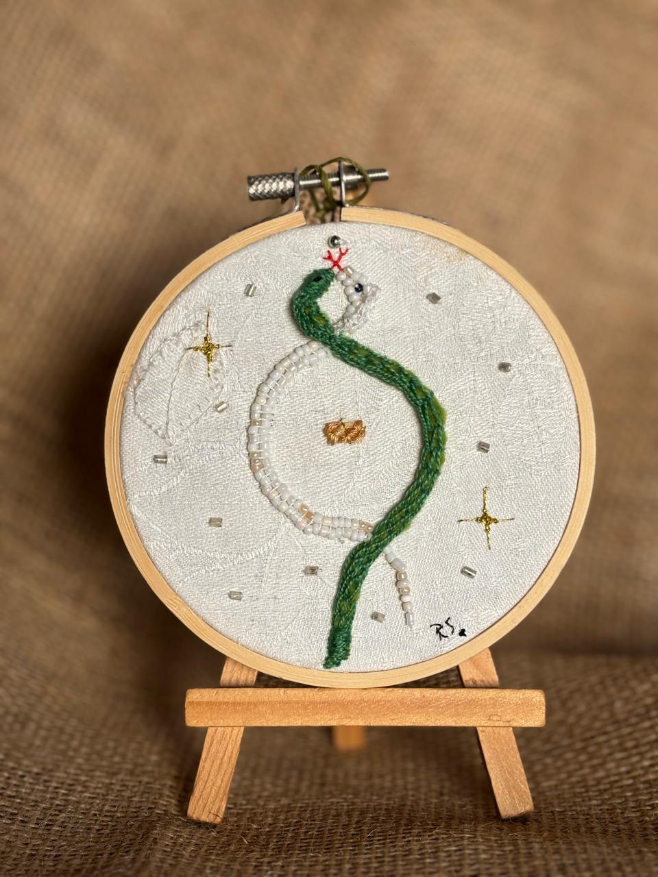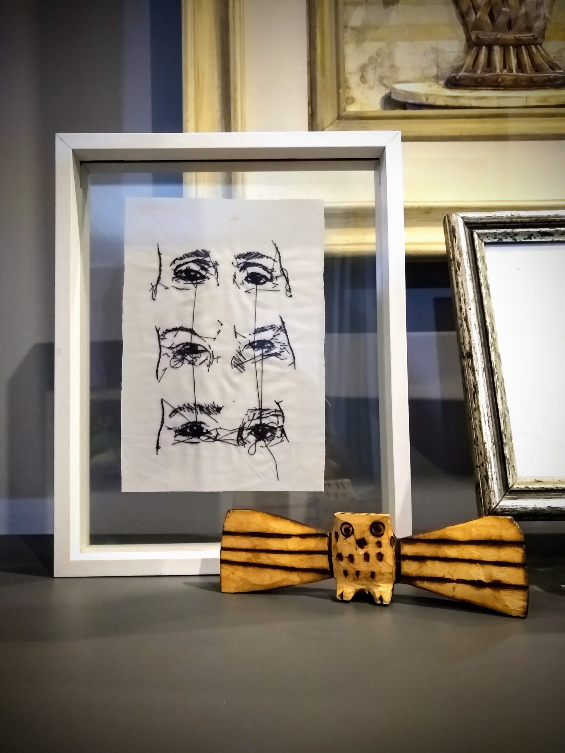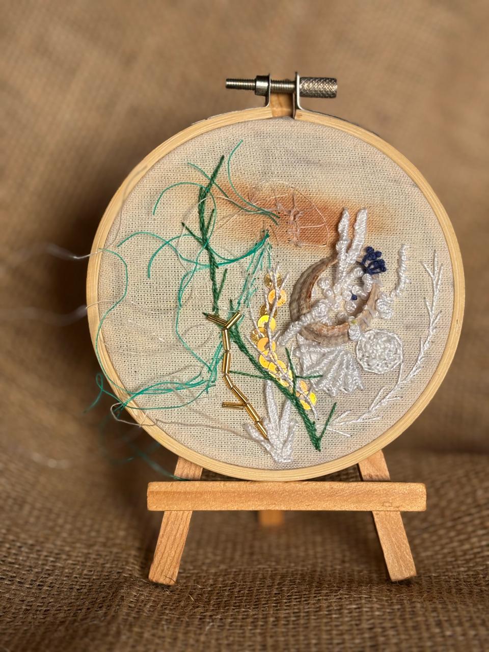 AmuletoBordado manual y serigrafía propia. 11cm.JulioBordado manual en tela antigua. Inspirado en Julio Cortázar. 16cm.BichaBordado de relieve en bastidor original. Lienzo antiguo. 11cmEntramadaBordado manual con apliques de tul. 13cmFondoBordado con tanza recuperada de la costa. En tela intervenida con tinte natural. 11cmAlma MaterBordado manual. Lienzo teñido con malbec. Bastidor en el que fue realizado. 38cm x 38cmManoCrearBordado manual enmarcado. Bastidor original de confección con aguja utilizada. 18,50cm x 18,50cmInternaBordado manual (revés). 26,5cm x 24cmInternoBordado manual (revés). 29cm x 25cmLa ComuniónBordado en tela con hilos de seda antiguos (pelo) y apliques de telas antiguas. 45cm x 45cm DescalzaÓleo sobre cartón 63cm x 51cmEl SaltoÓleo sobre tela inspirado en Baryshnikov 34cm x 28,5cm El nacimiento de las olasAcuarela intervenida con carbonilla, y bordado en papel. 27,5cm x 26cmIntroIlustración original intervenida. Enmarcada en vidrio. 31cm x 25cmRitualFotografía intervenidaLo que eraFotografía intervenidaCeibo FloreceCollage inspirado en poema con aplique de tejido vintage. 32cm x 25cmGon-KImpulsoCollage analógico. 27,5cm x 22,5cm Re-Misión TransgeneracionalMacramé tejido con apliques de alambre. 78cm x 98cm