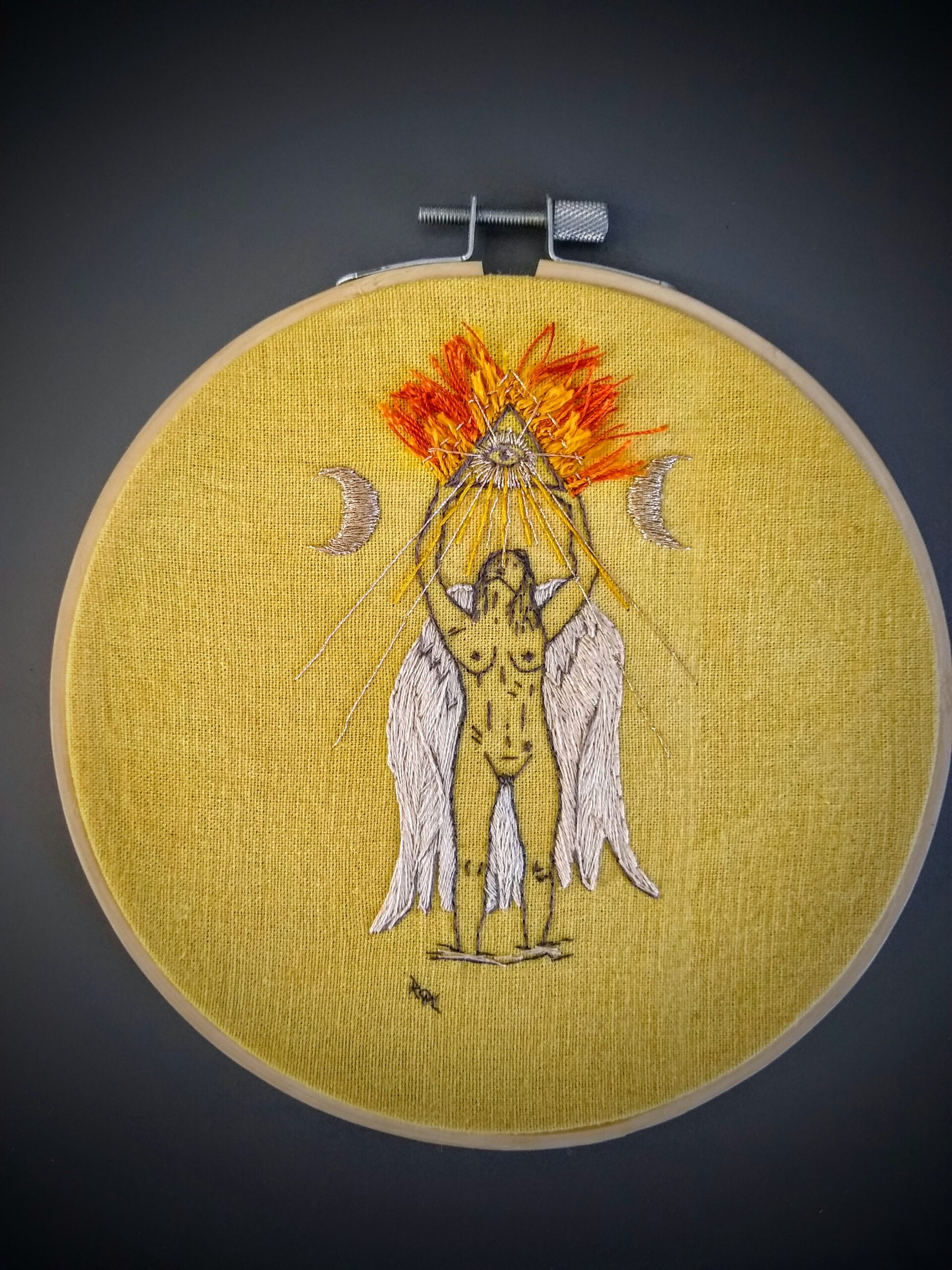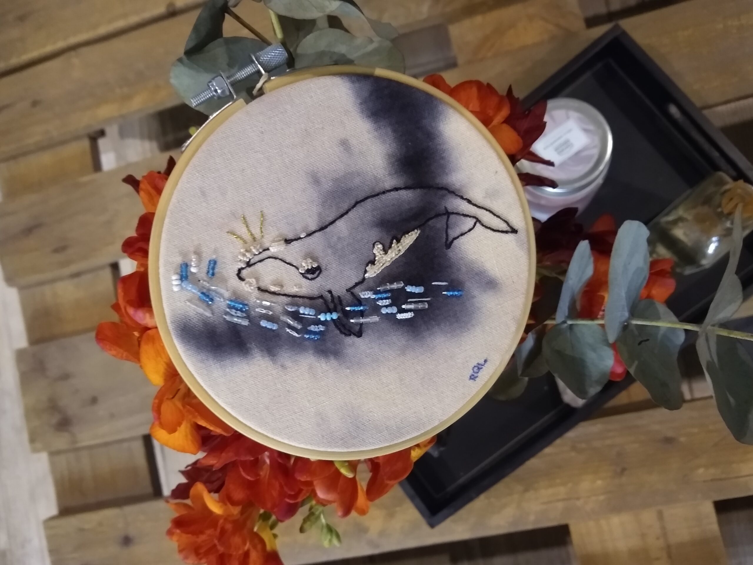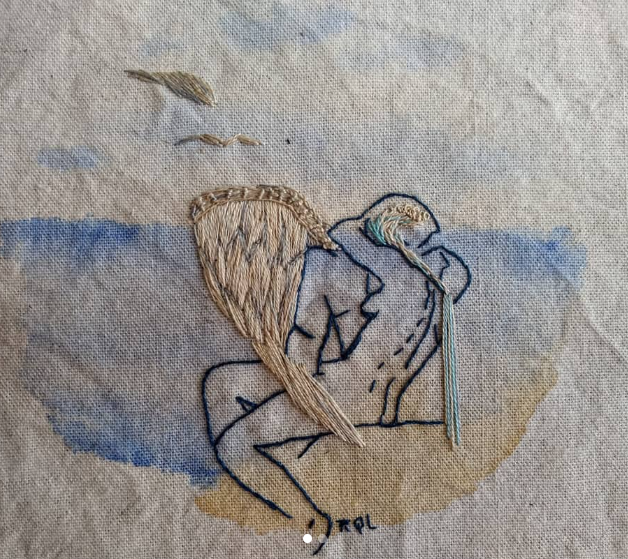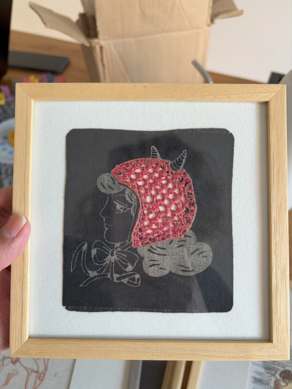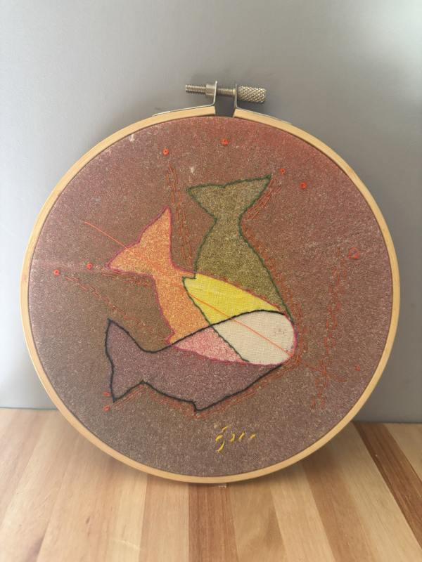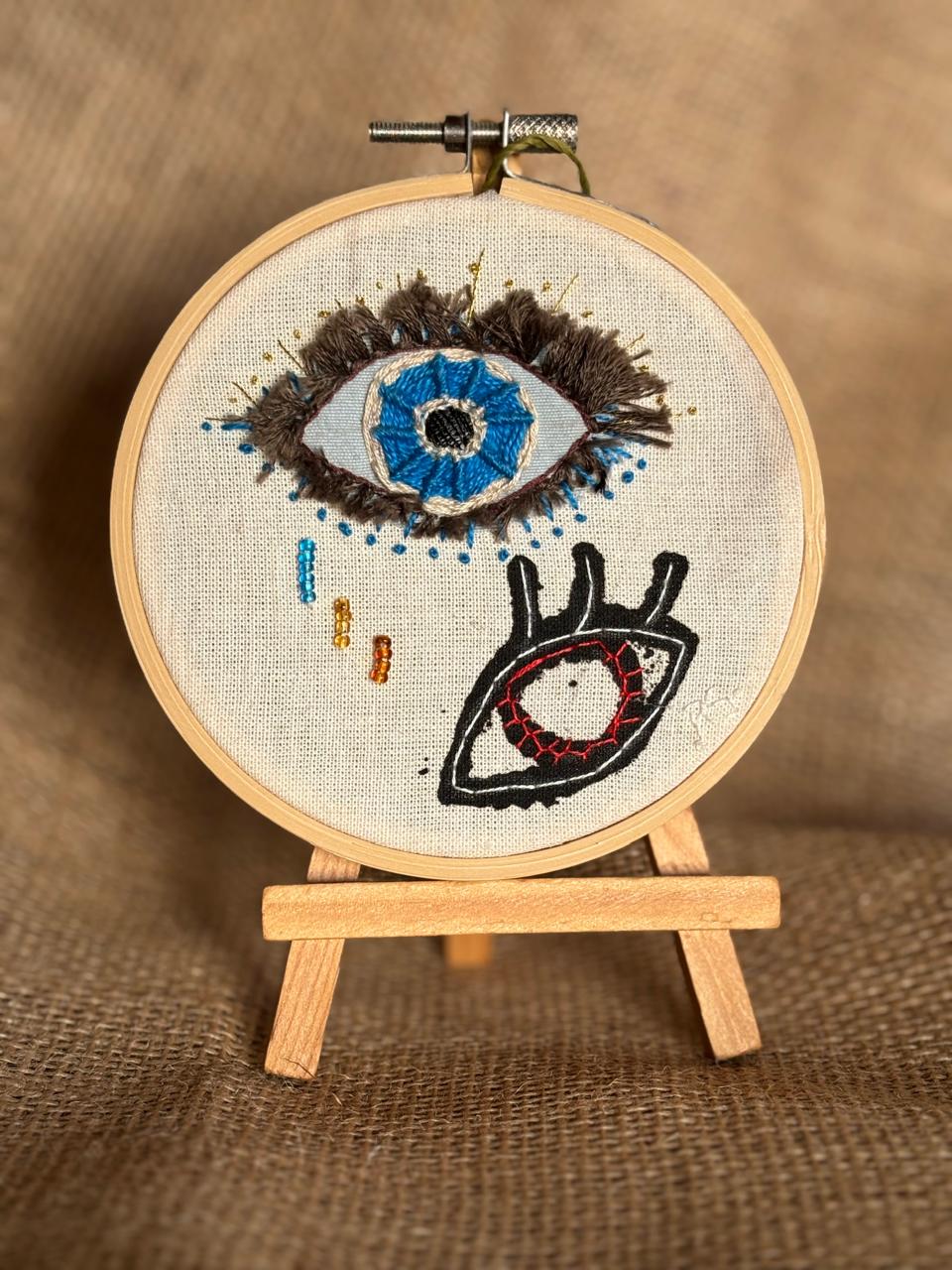 AmuletoBordado manual y serigrafía propia. 11cm.JulioBordado manual en tela antigua. Inspirado en Julio Cortázar. 16cm.BichaBordado de relieve en bastidor original. Lienzo antiguo. 11cmEntramadaBordado manual con apliques de tul. 13cmFondoBordado con tanza recuperada de la costa. En tela intervenida con tinte natural. 11cmAlma MaterBordado manual. Lienzo teñido con malbec. Bastidor en el que fue realizado. 38cm x 38cmManoCrearBordado manual enmarcado. Bastidor original de confección con aguja utilizada. 18,50cm x 18,50cmInternaBordado manual (revés). 26,5cm x 24cmInternoBordado manual (revés). 29cm x 25cmLa ComuniónBordado en tela con hilos de seda antiguos (pelo) y apliques de telas antiguas. 45cm x 45cm DescalzaÓleo sobre cartón 63cm x 51cmEl SaltoÓleo sobre tela inspirado en Baryshnikov 34cm x 28,5cm El nacimiento de las olasAcuarela intervenida con carbonilla, y bordado en papel. 27,5cm x 26cmIntroIlustración original intervenida. Enmarcada en vidrio. 31cm x 25cmRitualFotografía intervenidaLo que eraFotografía intervenidaCeibo FloreceCollage inspirado en poema con aplique de tejido vintage. 32cm x 25cmGon-KImpulsoCollage analógico. 27,5cm x 22,5cm Re-Misión TransgeneracionalMacramé tejido con apliques de alambre. 78cm x 98cm